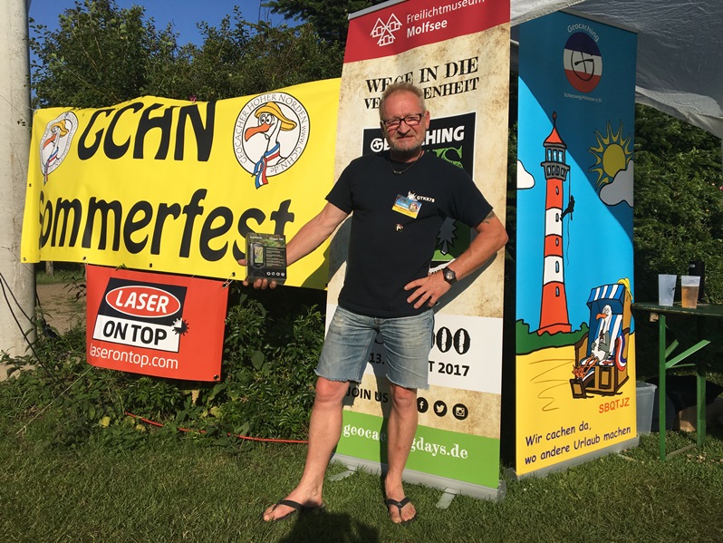 Der Freitag begann etwas "durchwachsen", es schüttete wie aus Eimern. Aber das kann einen Cacher nicht wirklich erschüttern! Sie kamen trotzdem alle und wurden dann am Samstag mit Bilderbuchwetter ab kurz nach dem Frühstück belohnt. Und das konnten wir auch gut gebrauchen für die zahllosen Aktivitäten, die das Orga-Team im Programm hatte, wie z.B. die Geolympiade, die riesige Hüpfburg, das Schnupperklettern mit McKay, die Quadtouren mit GrizzlyNF, das Kinderschminken mit Herrn clausi usw. etc... Ein Highlight des Tages war die große Tombola, in der neben dem Hauptpreis, einem niegelnagelneuen Oregon 700, die kompette GCHN-Serie in Gold vom Poller bis zum Leuchtturm auf glückliche Gewinner wartete. Und wie immer auf unseren Festen gab es auch einen Goldschatz zu ersteigern. Rollo gab nach heißem Kampf den Zuschlag für den Goldenen Leuchtturm incl. einem Aufsteller mit allen drei Sommerfest-Pins an Jan Buckwealth, der mit 200€ das höchste Gebot abgab. Das Geld geht an den Verein für das nächste Sommerfest. Vielen Dank! Das Losglück meinte es gut mit Rolloundbounty, die mit ihrem Los einen Goldenen Leuchtturm ergatterten. Kurz entschlossen stellten sie ihren Goldschatz zur Verfügung und machten damit einen Coiner aus dem tiefen Süden glücklich, der für weitere 200€ zugunsten des Vereinskontos seine GCHN-Serie vervollständigen konnte. Der Oregon ging mit seinem Los mit der Nummer 111 an orange-bus, der sein Glück kaum fassen konnte. Der Zufall wollte es, dass Rollo ausgerechnet am Haupteventtag seinen Geburtstag feierte. Und er ließ sich nicht lumpen und spendierte ein großes Fass Flens, um mit allen anzustoßen. Das Wetter spielte den ganzen Tag über mit, die letzten verließen das Lagerfeuer um kurz nach sechs am Sonntagmorgen. Gegen 13 Uhr am Sonntag sah der Platz dann wieder so aus, als wären wir nie dagewesen. Auch das zeichnet uns Cacher aus, wir hinterlassen unsere Plätze so wie wir sie vorgefunden haben! Deshalb nahm Bauer Jensen unsere Buchung für das nächste Jahr mit Freude entgegen. Save the date: Am 25. August 2018 geht es in die nächste Runde