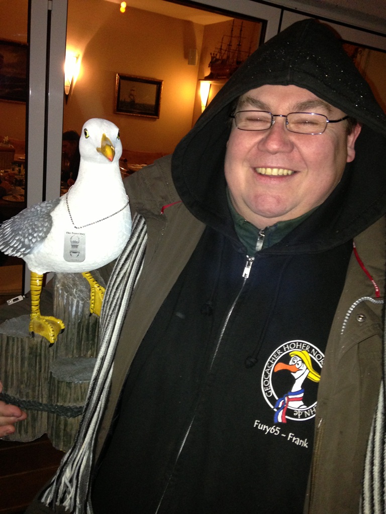 Cacher sind schon eine ganz besonderes Spezies. Denn anders ist es nicht zu erklären, dass sich über 120 Freaks im tiefsten Winter bis spät in die Nacht zusammen auf eine zugige Außenterrasse stellen und sichtlich Spaß dabei haben. Während der Rest der Bevölkerung es sich bei dem zu rolloundbounty - Events obligatorischem Schneegestöber auf dem Sofa gemütlich machte, ließen sich die Outdoorfreaks von den winterlichen Wetterkapriolen nicht davon abhalten, mit einem heißen Punsch in der einen und einer leckeren Bratwurst vom Wildschwein in der anderen Hand draußen zusammen einen vergnüglichen Abend zu erleben. Nachdem der Tag sich zunächst von seiner besten Seite gezeigt hatte, setzte etwa eine Stunde vor dem Event "plötzlich und unerwartet" heftiger Schneefall ein, der die Straßen binnen Minuten in Rutschbahnen verwandelte. Trotzdem änderten aber nur eine Handvoll ihre Pläne für den Abend. Zu unserer großen Freude schneite auch Mona Lisa bei uns vorbei, in Begleitung von Fury65. Darf die nächstes Mal auch mit nach Malle?